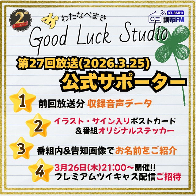 セット内容 (1)収録アーカイブデータ(2026年2月25日第26回放送分)をメールにて送付 (2)オリジナルポストカード、番組オリジナルステッカーを郵送 手書きメッセージ、イラスト、サイン付 (3)次回の放送番組内で、「公式サポーター」としてお名前をご紹介。また、SNS等で行う番組宣伝や、Youtubeのサムネイル等、各種宣伝画像等にて、お名前を明記いたします。 ※読み上げを希望するお名前(本名・ハンドルネームいずれも可)を備考欄にご記入ください。(ラジオ内での読み上げを希望しない、名前表記を希望しない、等特段の御希望がある場合は、備考欄にその旨をご記入ください。) (4)プレミアツイキャス配信にご招待(2026年3月26日(木)21:00スタート) ※ツイキャス配信の「招待URL」をお送りいたします。 (5)グッドラックポイント(GLP)を3ポイント進呈! ※グッドラックポイントとは、ラジオへのお便り投稿(1p)、公式サポーター登録(3p)、いずれかの参加で自動的に溜まる番組独自のポイントです。10ポイントまたは30ポイント溜めると素敵なプレゼントを差し上げます。