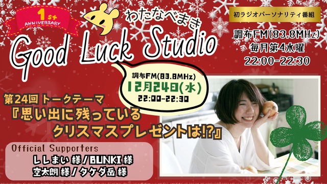 ★わたなべまきの初パーソナリティラジオ番組★ 調布FM『わたなべまきのGood Luck Studio』2025年12月24日放送(第24回) トークテーマ:『思い出に残っているクリスマスプレゼントは!?』 《第24回 放送楽曲》 2025/The Chrismas Song/愛のバビロン/はだかの蝶(BGM)/月夜のタクシー(BGM)