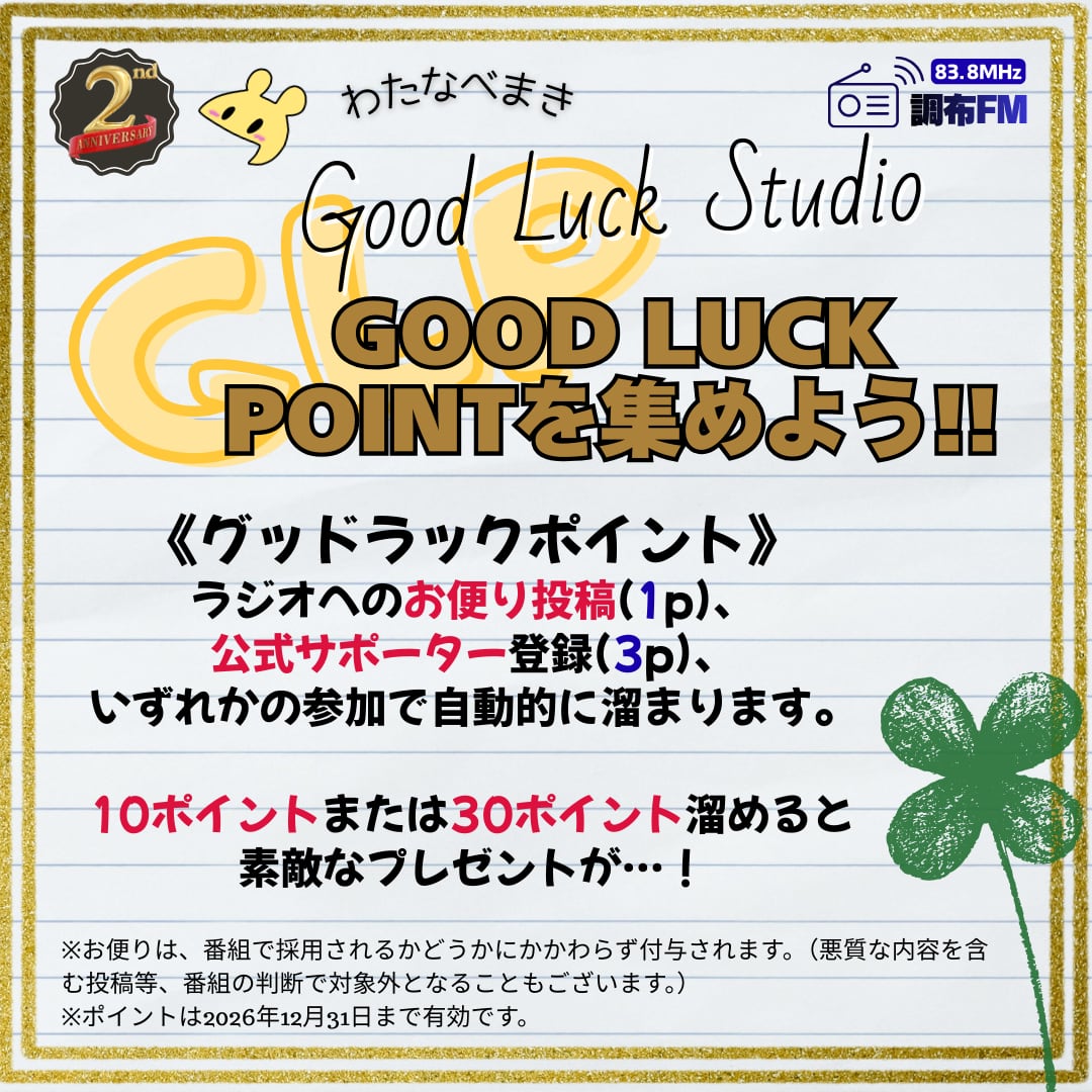 ※グッドラックポイントとは、ラジオへのお便り投稿(1p)、公式サポーター登録(3p)、いずれかの参加で自動的に溜まる番組独自のポイントです。10ポイントまたは30ポイント溜めると素敵なプレゼントを差し上げます。